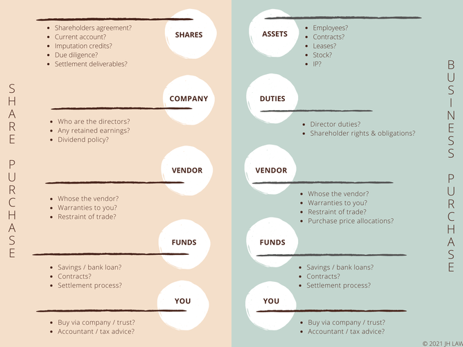 2. What are the different contracts and processes involved in a share versus business sale and purchase?